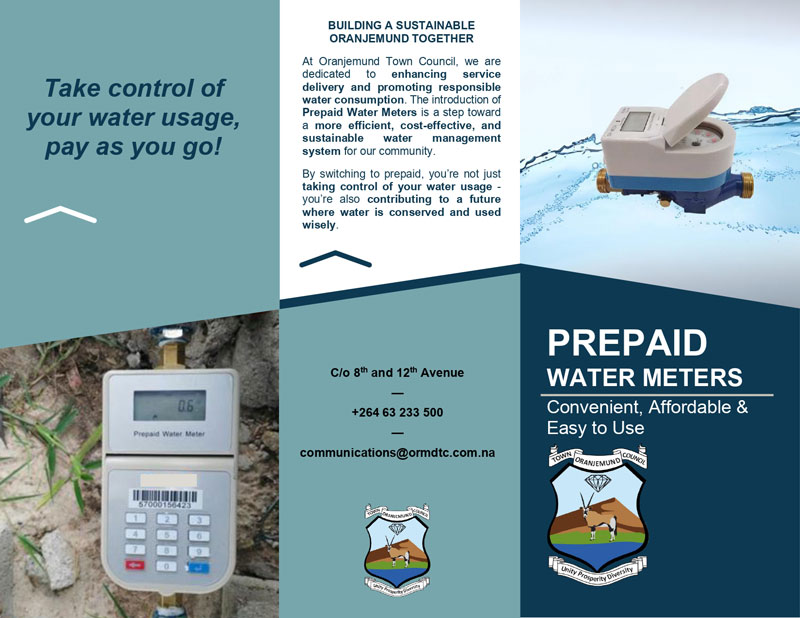 The Oranjemund Town Council provides both conventional water meters and prepaid meters to ensure efficient water usage and billing for residents and businesses.